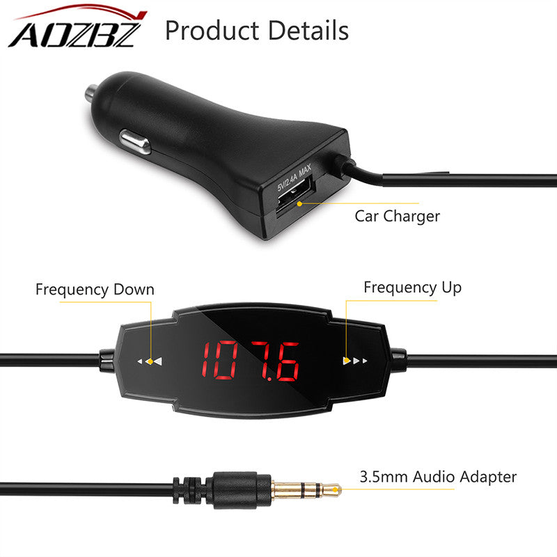 AOZBZ FM Transmitter Car Charger MP3 Player 2.4A Output 3.5mm Audio Cable LED Display FM Frequency DC12-24V USB 2.0 Port